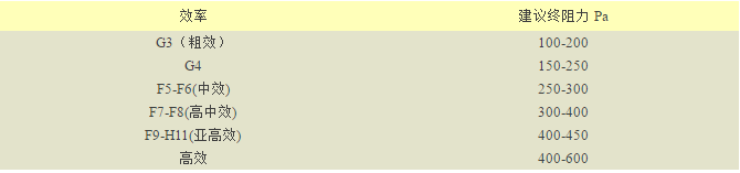 2.终阻力:随着沾尘量的增大,阻力逐步增加,风量逐点降低,当阻力达到允许的最大值(规定值)时,该阻力为终阻力。随着运行时间的延长,过滤器积尘使阻力逐渐增大。为保证系统的风量能保持在正常运行条件,一般取过滤器初阻力的两倍作为终阻力。