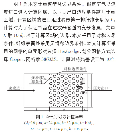 德国学者Albrecht[2]和Kaufmann[3]是最早对过滤器进行初步研究的,他们针对纤维垫开始气溶胶过滤机制的理论探讨。此后,国际上许多学者先后对过滤器的性能进行了试验和数值研究,不过这些研究大多建立在二维过滤器模型基础之上。但是为了找出过滤器结构和过滤器介质过滤性能之间的关系,这些研究还是不够的。本文在上述研究的基础上,对三维交错排列的空气过滤器内部气相流场进行数值模拟,计算不同运行条件下过滤器的阻力及纤维的阻力系数,以期对优化空气过滤器结构做一些有益的探索。
