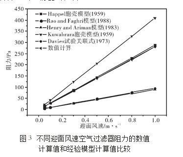 (2)在预测过滤器阻力方面,数值计算结果和Daives的实验关联式吻合较好,误差在2%以内,而除了Happel经验模型以外,其它模型预测值和实验关联式误差较大。数值计算结果也表明,随着风速的增加,阻力呈线性增加。