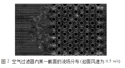 图2为过滤器内某一截面的流场分布。从该图可以看出:空气流过纤维时,在纤维的前壁速度减小,而在各纤维之间,速度都出现增加的趋势,但是由于纤维是交错排列的,所以与平行排列时不同的是在柱状纤维的尾部,没有形成明显的旋涡。而且从图中还可以看到:从过滤器入口的第一排纤维到最后一排纤维之间的流场结构基本呈周期性变化。